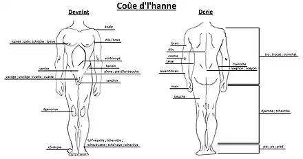 Exemple : çhouçhaie (souffler), prononcé [çuˈçɛː]. - tçh, ty ou ti, qui représente le son [c][12] ; de même que pour dy qui note le son [ɟ][13]. Néanmoins, par influence de la graphie, certains locuteurs prononcent respectivement [tj] et [dj].