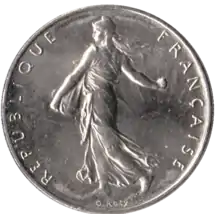 Après une période de grande stabilité au XIXe siècle, le franc va connaître de nombreuses dévaluations à partir de la Première Guerre mondiale. Le franc Germinal ou franc-or (1803-1928) est remplacé par le franc Poincaré qui, après plusieurs nouvelles dévaluations, deviendra en 1959 l'ancien franc (1928-1959). Pendant la Seconde Guerre mondiale, les zones libérées ont utilisé temporairement plusieurs dénominations du franc liées au dollar américain, mais le franc Poincaré est rapidement redevenu indépendant en métropole, dans les DOM et en Afrique du Nord. Le franc Pinay (d'Antoine Pinay) ou franc lourd dit nouveau franc (1959-2002) redonne à la monnaie nationale française un peu de son lustre d'antan : 1 nouveau franc = 100 anciens francs. L'État frappe à nouveau des francs en argent dont la pièce de 5 francs Semeuse. Le franc avait également cours légal dans les régions françaises d'outre-mer (Guyane, Martinique, Guadeloupe, Réunion), les collectivités départementales de Mayotte et de Saint-Pierre-et-Miquelon, et les Terres australes et antarctiques françaises. Au , le franc a continué de coexister parallèlement à l'introduction de l'euro. Dès le , les pièces et billets libellés en franc ont été progressivement retirés de la circulation pour être définitivement remplacés par l'euro (EUR ou €) avec la parité de 1 EUR = 6,55957 FRF. | ||