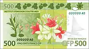 500 francs | 120 × 66 | Vert | Flore | Recto * Motif principal (centre, droite) : Fleurs d'Oiseau de paradis sur fond de motifs de bambou gravé * Motif secondaire (centre, avec les signatures) : Feuilles de taro * Bord inférieur : Motifs de bambou gravé (océan et soleil, pirogue, pins colonnaires, case) |