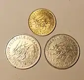 En 1960, la Banque centrale des états de l'Afrique équatoriale et du Cameroun fait frapper une pièce de 50 francs en cupro-nickel avec la mention État du Cameroun, et la devise Paix - Travail - Patrie ; les pièces de 1, 5, 10 et 25 francs continuent d'être émises avec la mention Cameroun. Des pièces de 100 francs sont frappées à partir de 1966 jusqu'en 1968, en cupro-nickel. En 1971, la pièce de 100 francs porte désormais la mention République fédérale du Cameroun, puis l'année suivante, la mention bilingue Cameroun - Cameroon. En 1986, une pièce de 500 francs en cupro-nickel est émise avec la mention bilingue République du Cameroun - Republic of Cameroon[2].
