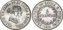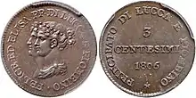 | Avers : Bustes d'Élisa et Félix tournés vers la droite, avec l'inscription FELICE ED ELISA PP•DI LUCCA E PIOMBINO. | Revers : Valeur au centre d'une couronne de laurier et de l'inscription PRINCIPATO DI LUCCA E PIOMBINO, et millésime en exergue | ||||
