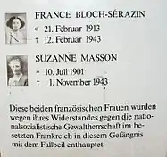 « Diese beiden französischen Frauen wurden wegen ihres Widerstandes gegen die nationalsozialistische Gewaltherrschaft im besetzten Frankreich in diesem Gefängnis mit dem Fallbeil enthauptet »[16]