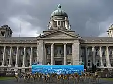 Le monument Hier und Jetzt est un bloc de béton avec la date 1933 vis-à-vis de l'entrée du tribunal. À l'autre côté du bloc vu de la place du tribunal (Hanseatisches Oberlandesgericht) se trouve une grande photo de Hambourg en couleurs bleus, bordée de fleurs plantées en pot sur des stèles en fer. Le monument est à la mémoire des personnes condamnées à mort par la justice de Hambourg et des personnes exécutées pendant la période nazie dans la cour de la prison (Untersuchungsgefängnis am Holstenglacis)[17].