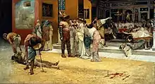- The painting of Gladiator Games at Museo di Capodimonte. The painting at the website is described as not as a mere evocation of the ancient past, since some details such as the gladiatorial helmet are accurate, while others, the slaying of a gladiator as meal entertainment, less so, however, the painting has a more contemporary implication, depicting the persistent gulf between the well-fed plutocrats and the enslaved proletariat.