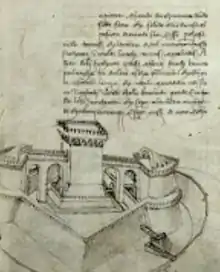 - Traité I, concernant l'architecture, des machines, des écluses, des barrages, des aqueducs souterrains et de l'art militaire, datant probablement de la période 1478-1481: Le manuscrit Ashburnham no 361 (Bibliothèque Laurentienne)[14] et le codex Saluzziano no 148 (Bibliothèque royale de Turin)[15]. Le manuscrit Ashburnham est incomplet et contient essentiellement la partie mécanique du traité, mais son intérêt vient de ce qu'il a été annoté par Léonard de Vinci.