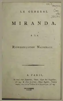 - Miranda aux représentants du peuple français, In-8° , 8 p., Édition : (S. l. n. d.) — Protestation contre sa détention illégale.