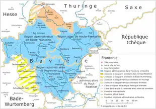 À l'est, le Fichtelgebirge jouxte la République tchèque et le Haut-Palatinat bavarois. Les hauteurs du Jura franconien marquent le sud de la frontière avec la région de l'ancienne Bavière (Altbayern), la Souabe historique et le bassin du Danube. Les territoires du nord de la Haute-Bavière, l'arrondissement et l'évêché d'Eichstätt sont également considérés comme faisant partie de la Franconie.