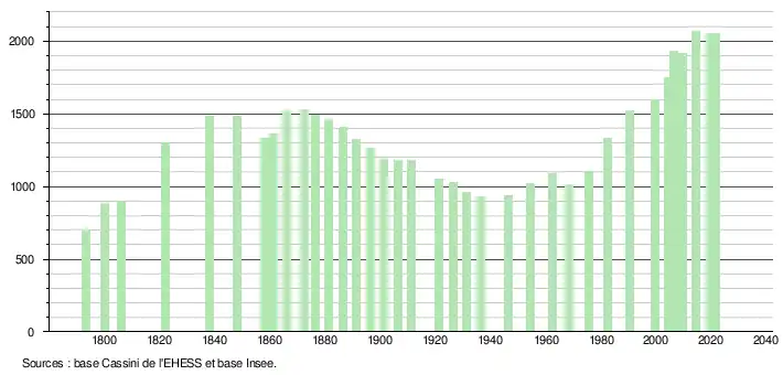 L'évolution du nombre d'habitants est connue à travers les recensements de la population effectués dans la commune depuis 1793. Pour les communes de moins de 10 000 habitants, une enquête de recensement portant sur toute la population est réalisée tous les cinq ans, les populations légales des années intermédiaires étant quant à elles estimées par interpolation ou extrapolation[17]. Pour la commune, le premier recensement exhaustif entrant dans le cadre du nouveau dispositif a été réalisé en 2004[18].
