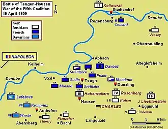 Lors de la bataille de Teugen-Hausen, le 19 avril, il a sous ses ordres les brigades Kayser et Thierry, chacune à six bataillons[16]. Après avoir détaché Thierry sur l'aile gauche, Lusignan vient renforcer les troupes de Vukassovich avec la brigade Kayser entre les villages de Teugn et Hausen, face à la division française du général Saint-Hilaire[17]. De violents combats ont lieu dans les bois et les collines environnantes. Encouragés par l'exemple de leurs généraux, qui s'exposent à cette occasion en première ligne, les Autrichiens parviennent à chasser les Français des hauteurs avant d'être stoppés net par leur ligne de défense. L'intervention tardive mais décisive de l'artillerie de Davout achève de précipiter la retraite autrichienne, jusqu'à ce qu'un orage vienne mettre fin aux affrontements[18]. Lusignan, qui de l'avis de Digby Smith a une nouvelle fois « fait montre de ses talents », est grièvement blessé à la tête pendant le combat[2].
