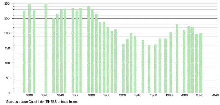 L'évolution du nombre d'habitants est connue à travers les recensements de la population effectués dans la commune depuis 1793. Pour les communes de moins de 10 000 habitants, une enquête de recensement portant sur toute la population est réalisée tous les cinq ans, les populations légales des années intermédiaires étant quant à elles estimées par interpolation ou extrapolation[18]. Pour la commune, le premier recensement exhaustif entrant dans le cadre du nouveau dispositif a été réalisé en 2005[19].