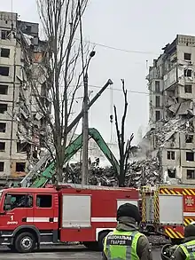 Le 15 janvier, le Service d'urgence de l'État ukrainien a signalé que 23 personnes avaient été tuées par une frappe de missile russe sur le bâtiment[21]. À 13 h 15 (le lendemain) 43 signalements de personnes disparues ont été reçus, 72 personnes ont été blessées, dont 13 enfants, et 39 ont été secourues. Dans l'après-midi du 15 janvier, le président ukrainien Volodymyr Zelensky a exprimé sur Telegram ses condoléances aux familles des 25 personnes tuées dans l'attaque[22]. Dans la matinée du 16 janvier, le gouverneur de l'oblast de Dnipropetrovsk, Valentyn Reznitchenko, a mis à jour le bilan des morts à 35 personnes, dont deux enfants. 39 personnes avaient été secourues et 75 blessées, dont 14 enfants. 35 résidents de l'immeuble étaient toujours portés disparus. La destruction du bâtiment a laissé environ 400 personnes sans abri. 236 appartements ont été détruits. L'opération de recherche et de sauvetage a été annulée le mardi 17, alors que le bilan s'élevait à 44 morts, dont cinq enfants. 79 personnes avaient été blessées et 39 secourues[23].