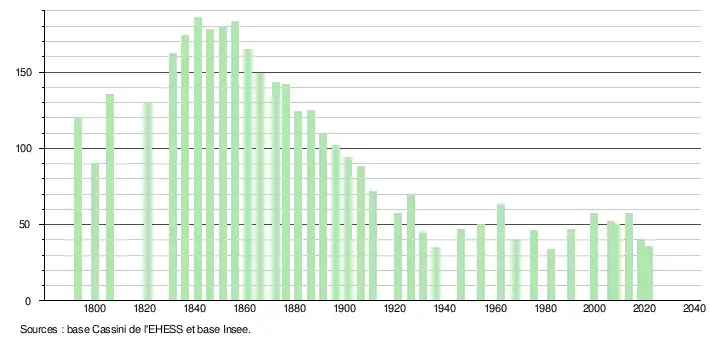L'évolution du nombre d'habitants est connue à travers les recensements de la population effectués dans la commune depuis 1793. Pour les communes de moins de 10 000 habitants, une enquête de recensement portant sur toute la population est réalisée tous les cinq ans, les populations légales des années intermédiaires étant quant à elles estimées par interpolation ou extrapolation[22]. Pour la commune, le premier recensement exhaustif entrant dans le cadre du nouveau dispositif a été réalisé en 2008[23].