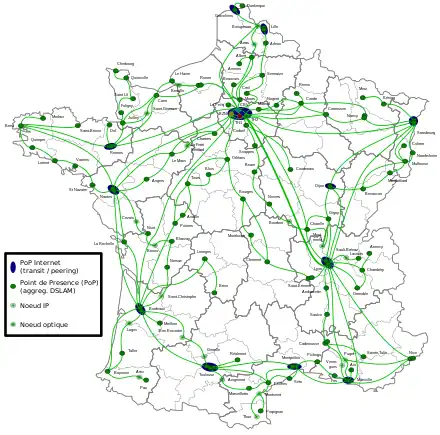 Free possède le 3e réseau privé (DWDM classique) en termes de couverture nationale et de capacité (58 300 km de fibre optique en décembre 2010). Le réseau de Free est désormais international. Il est présent :