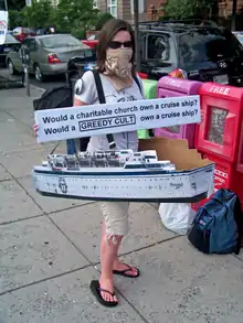 - Un culte avide possèderait-il un navire de croisière ? La photo a été prise lors de la marche Over 9000 Anon, organisée pour s'opposer aux pratiques de secte de l'Église de scientologie (19 juillet 2008, Washington).
