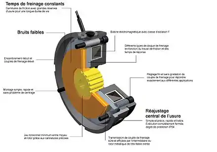 - le frein est composé d’une bobine électromagnétique qui, lorsqu’elle est excitée sous un courant électrique, engendre un champ magnétique ;