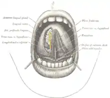 Schéma anatomique de la cavité buccale avec la langue relevée mettant en évidence le frein (frenulum)