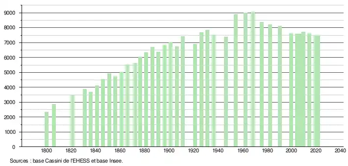 L'évolution du nombre d'habitants est connue à travers les recensements de la population effectués dans la commune depuis 1800. Pour les communes de moins de 10 000 habitants, une enquête de recensement portant sur toute la population est réalisée tous les cinq ans, les populations légales des années intermédiaires étant quant à elles estimées par interpolation ou extrapolation[32]. Pour la commune, le premier recensement exhaustif entrant dans le cadre du nouveau dispositif a été réalisé en 2004[33].