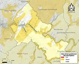 Le retrait-gonflement des sols argileux est susceptible d'engendrer des dommages importants aux bâtiments en cas d’alternance de périodes de sécheresse et de pluie. 40,6 % de la superficie communale est en aléa moyen ou fort (33,6 % au niveau départemental et 48,5 % au niveau national). Sur les 589 bâtiments dénombrés sur la commune en 2019, 293 sont en aléa moyen ou fort, soit 50 %, à comparer aux 25 % au niveau départemental et 54 % au niveau national. Une cartographie de l'exposition du territoire national au retrait gonflement des sols argileux est disponible sur le site du BRGM[17],[Carte 2].