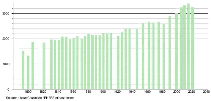 L'évolution du nombre d'habitants est connue à travers les recensements de la population effectués dans la commune depuis 1793. Pour les communes de moins de 10 000 habitants, une enquête de recensement portant sur toute la population est réalisée tous les cinq ans, les populations légales des années intermédiaires étant quant à elles estimées par interpolation ou extrapolation[35]. Pour la commune, le premier recensement exhaustif entrant dans le cadre du nouveau dispositif a été réalisé en 2005[36].