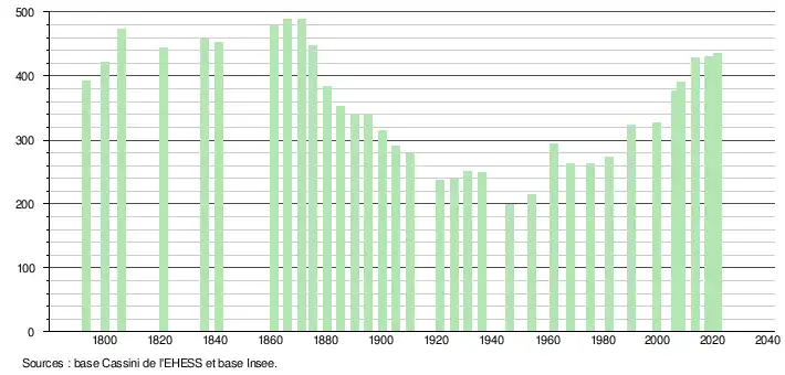 L'évolution du nombre d'habitants est connue à travers les recensements de la population effectués dans la commune depuis 1793. Pour les communes de moins de 10 000 habitants, une enquête de recensement portant sur toute la population est réalisée tous les cinq ans, les populations légales des années intermédiaires étant quant à elles estimées par interpolation ou extrapolation[17]. Pour la commune, le premier recensement exhaustif entrant dans le cadre du nouveau dispositif a été réalisé en 2008[18].