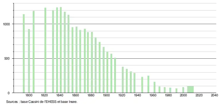 | L'évolution du nombre d'habitants est connue à travers les recensements de la population effectués dans la commune depuis 1793. Pour les communes de moins de 10 000 habitants, une enquête de recensement portant sur toute la population est réalisée tous les cinq ans, les populations légales des années intermédiaires étant quant à elles estimées par interpolation ou extrapolation[41]. Pour la commune, le premier recensement exhaustif entrant dans le cadre du nouveau dispositif a été réalisé en 2005[42]. En 2021, la commune comptait 82 habitants[Note 7], en diminution de 11,83 % par rapport à 2015 (Ariège : +1,38 %, France hors Mayotte : +1,84 %). |