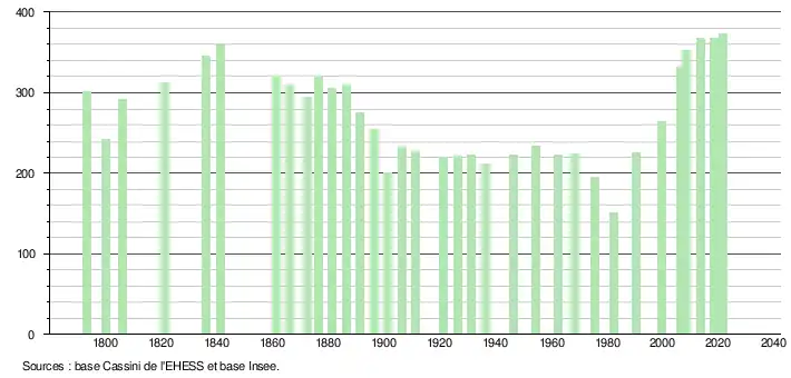 L'évolution du nombre d'habitants est connue à travers les recensements de la population effectués dans la commune depuis 1793. Pour les communes de moins de 10 000 habitants, une enquête de recensement portant sur toute la population est réalisée tous les cinq ans, les populations légales des années intermédiaires étant quant à elles estimées par interpolation ou extrapolation[17]. Pour la commune, le premier recensement exhaustif entrant dans le cadre du nouveau dispositif a été réalisé en 2008[18].