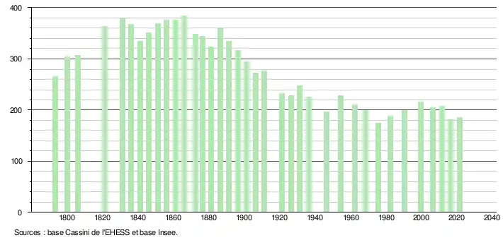L'évolution du nombre d'habitants est connue à travers les recensements de la population effectués dans la commune depuis 1793. Pour les communes de moins de 10 000 habitants, une enquête de recensement portant sur toute la population est réalisée tous les cinq ans, les populations légales des années intermédiaires étant quant à elles estimées par interpolation ou extrapolation[23]. Pour la commune, le premier recensement exhaustif entrant dans le cadre du nouveau dispositif a été réalisé en 2006[24].