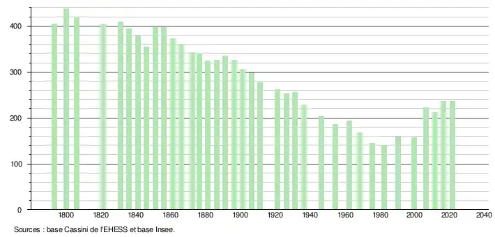 L'évolution du nombre d'habitants est connue à travers les recensements de la population effectués dans la commune depuis 1793. Pour les communes de moins de 10 000 habitants, une enquête de recensement portant sur toute la population est réalisée tous les cinq ans, les populations légales des années intermédiaires étant quant à elles estimées par interpolation ou extrapolation[39]. Pour la commune, le premier recensement exhaustif entrant dans le cadre du nouveau dispositif a été réalisé en 2006[40].