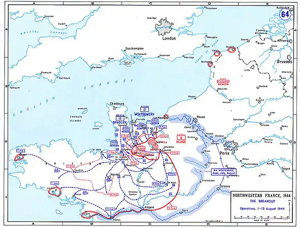 Mais le 25 juillet, les Alliés réussissent à ouvrir une brèche dans les défenses allemandes dans le sud du Cotentin. Les divisions américaines s'y engouffrent et lancent une grande percée vers le sud. Les Alliés libèrent la Bretagne (à l'exception des principaux ports fortifiés où les Allemands se sont retranchés), avancent jusqu’à la Loire, puis remontent vers le nord-est, prenant à revers le front allemand. Comme il le fera plusieurs fois sur le front de l'Est, Hitler refuse un repli tactique, conseillé par ses généraux, et ordonne une contre-attaque à Mortain qui est un échec, les troupes allemandes subissent alors de lourdes pertes, piégées dans la poche de Falaise.