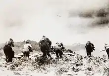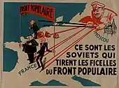 Dans le même temps, les communistes couvrent d'éloges le Parti radical, héritier selon eux de la Révolution française et représentant d'une classe moyenne désormais solidaire du prolétariat[18]. Le dernier verrou tombe lorsque l'Union soviétique se rapproche de la France à la suite de la visite de Pierre Laval à Moscou en mai 1935. Le PCF peut désormais voter les budgets militaires et laisse libre cours à un discours patriotique[19] qui tranche avec ses positions antérieures et ne peut que satisfaire les radicaux.