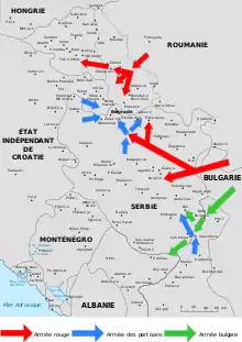 La Serbie « indépendante » est occupée pour l'essentiel par l'Allemagne et, au Sud-Est, par la Bulgarie. Une partie de son territoire est partagée entre les envahisseurs, en fonction des populations qui s'y trouvent. En Voïvodine, l'Allemagne confère au Banat un statut de zone occupée à statut particulier, dont l'administration est confiée aux Volksdeutsche (Allemands) locaux ; dans la même région, la Hongrie annexe la Bačka. En Croatie, l'Italie annexe la Dalmatie centrale, mais doit négocier avec le nouveau gouvernement croate les frontières de son gouvernorat de Dalmatie. Elle occupe le Monténégro, dont elle annexe la région des bouches de Kotor et dont elle projette de faire un troisième État « indépendant »[44],[20],[47],[48]. Par ailleurs, la Hongrie annexe également une partie de la Slavonie[49].