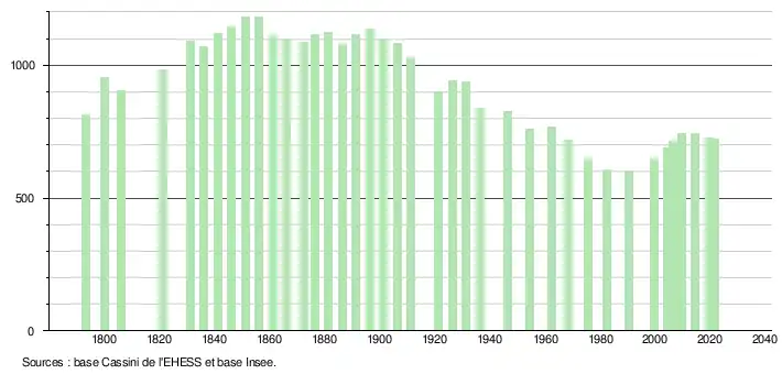 L'évolution du nombre d'habitants est connue à travers les recensements de la population effectués dans la commune depuis 1793. Pour les communes de moins de 10 000 habitants, une enquête de recensement portant sur toute la population est réalisée tous les cinq ans, les populations légales des années intermédiaires étant quant à elles estimées par interpolation ou extrapolation[19]. Pour la commune, le premier recensement exhaustif entrant dans le cadre du nouveau dispositif a été réalisé en 2004[20].