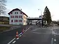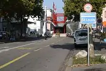 Frontière à Delle - Boncourt. À gauche, la France ; à droite, la Suisse. | |