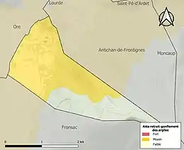 Le retrait-gonflement des sols argileux est susceptible d'engendrer des dommages importants aux bâtiments en cas d’alternance de périodes de sécheresse et de pluie. 67,7 % de la superficie communale est en aléa moyen ou fort (88,8 % au niveau départemental et 48,5 % au niveau national). Sur les 64 bâtiments dénombrés sur la commune en 2019, 64 sont en aléa moyen ou fort, soit 100 %, à comparer aux 98 % au niveau départemental et 54 % au niveau national. Une cartographie de l'exposition du territoire national au retrait gonflement des sols argileux est disponible sur le site du BRGM[32],[Carte 3].
