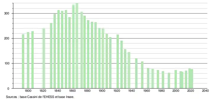 L'évolution du nombre d'habitants est connue à travers les recensements de la population effectués dans la commune depuis 1793. Pour les communes de moins de 10 000 habitants, une enquête de recensement portant sur toute la population est réalisée tous les cinq ans, les populations légales des années intermédiaires étant quant à elles estimées par interpolation ou extrapolation[37]. Pour la commune, le premier recensement exhaustif entrant dans le cadre du nouveau dispositif a été réalisé en 2008[38].