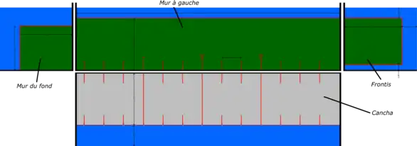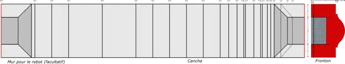 - la cancha (surface jouable au sol de 36 m de long pour 9,5 m de large) ;