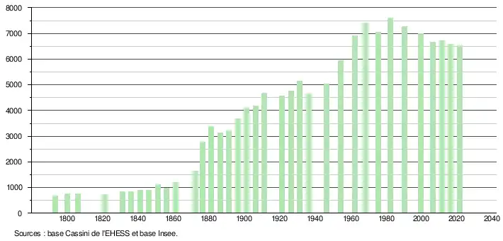 L'évolution du nombre d'habitants est connue à travers les recensements de la population effectués dans la commune depuis 1793. Pour les communes de moins de 10 000 habitants, une enquête de recensement portant sur toute la population est réalisée tous les cinq ans, les populations légales des années intermédiaires étant quant à elles estimées par interpolation ou extrapolation[29]. Pour la commune, le premier recensement exhaustif entrant dans le cadre du nouveau dispositif a été réalisé en 2006[30].