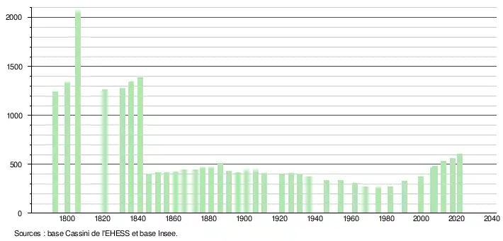 L'évolution du nombre d'habitants est connue à travers les recensements de la population effectués dans la commune depuis 1793. Pour les communes de moins de 10 000 habitants, une enquête de recensement portant sur toute la population est réalisée tous les cinq ans, les populations légales des années intermédiaires étant quant à elles estimées par interpolation ou extrapolation[23]. Pour la commune, le premier recensement exhaustif entrant dans le cadre du nouveau dispositif a été réalisé en 2007[24].
