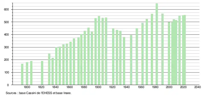 L'évolution du nombre d'habitants est connue à travers les recensements de la population effectués dans la commune depuis 1793. Pour les communes de moins de 10 000 habitants, une enquête de recensement portant sur toute la population est réalisée tous les cinq ans, les populations légales des années intermédiaires étant quant à elles estimées par interpolation ou extrapolation[22]. Pour la commune, le premier recensement exhaustif entrant dans le cadre du nouveau dispositif a été réalisé en 2004[23].