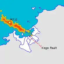 La faille majeure la plus connue de Fukuoka, la faille de Kego, est positionnée du nord-ouest vers le sud-est, approximativement parallèle avec la ligne de chemin de fer de Nishitetsu's Omuta, et était censée mesurer 22 km de long. On estimait qu'elle pouvait produire des tremblements de terre d'une magnitude de 7 en son centre, environ une fois tous les 15 000 ans. Si son foyer était situé à une profondeur de 10 km, cela se traduirait par un tremblement de terre d'une magnitude inférieure à 6 (comme celui du 20 mars 2005) dans le centre de Fukuoka, si l'épicentre se trouvait là. La probabilité d'un tremblement de terre le long de la partie connue de la faille de Kego pour les 30 années à venir avait été estimée à 0,4 % avant le tremblement de terre du 20 mars 2005, mais cette estimation a dû être revue à la hausse depuis lors. En incluant la nouvelle extension se trouvant dans la mer de Genkai, on estime désormais que la faille de Kego mesure 40 km de long.[réf. nécessaire]