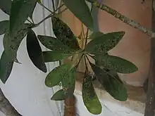Fumagine provoquée par le développement de cochenilles sur une feuille d'Eucalyptus dives. | |