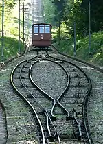 Le plus généralement, un funiculaire circule sur une voie ferrée unique qui comporte au milieu du parcours un tronçon doublé pour le croisement des véhicules. Cet évitement central, appelé évitement Abt[n 3], fonctionne sans aiguille mobile grâce à la disposition particulière des essieux des véhicules. Ceux-ci sont équipés de roues à gorge (à deux boudins) qui guident le train sur le rail continu côté extérieur de l'évitement, et de roues tambours (sans boudin) aptes à franchir le « cœur »[n 4] de l'aiguillage sur le rail côté intérieur de l'évitement. Cette disposition d'essieux est inversée d'un train à l'autre, permettant de définir, lors de la conception de l'appareil, un côté de franchissement différent pour chaque véhicule[2]. L'aiguille fonctionne ainsi sans intervention humaine, sans risque de collision des cabines ou de croisement des câbles.