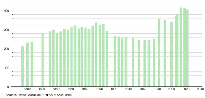 L'évolution du nombre d'habitants est connue à travers les recensements de la population effectués dans la commune depuis 1793. Pour les communes de moins de 10 000 habitants, une enquête de recensement portant sur toute la population est réalisée tous les cinq ans, les populations légales des années intermédiaires étant quant à elles estimées par interpolation ou extrapolation[17]. Pour la commune, le premier recensement exhaustif entrant dans le cadre du nouveau dispositif a été réalisé en 2007[18].