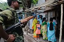 Soldat indien protégeant un bureau de vote dans l'ouest du Bengale en 2009 (archive d'Al Jazeera English). Son Fusil 1A est facilement différenciable du FAL par ses garnitures orange.