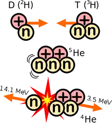 , qui a le mérite de n'utiliser que du combustible disponible en abondance et de ne pas produire de neutrons, mais nécessite des températures dix fois plus élevées (environ un milliard de kelvins)[26],[alpha 2].
