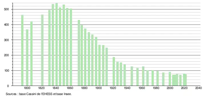 L'évolution du nombre d'habitants est connue à travers les recensements de la population effectués dans la commune depuis 1793. Pour les communes de moins de 10 000 habitants, une enquête de recensement portant sur toute la population est réalisée tous les cinq ans, les populations légales des années intermédiaires étant quant à elles estimées par interpolation ou extrapolation[18]. Pour la commune, le premier recensement exhaustif entrant dans le cadre du nouveau dispositif a été réalisé en 2004[19].