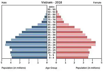 La population du Vietnam est passée de 60 millions d'habitants en 1986 à 97 millions en 2018, le taux de croissance étant tombé à environ 1 % à la fin des années 2010. Comme le Bangladesh et contrairement à l'Égypte, le Vietnam est un pays en développement qui a réussi à freiner sa croissance démographique[23]. L'âge médian du Vietnam en 2018 était de 26 ans et il est en hausse. Entre les années 1970 et la fin des années 2010, l'espérance de vie a grimpé de 60 à 76 ans[49]. Il est désormais le deuxième plus élevé d'Asie du Sud-Est. Le taux de fécondité du Vietnam est passé de 5 enfants par femme en 1980 à 3,55 en 1990, puis à 1,95 en 2017. Cette même année, 23% de la population vietnamienne était âgée de 15 ans ou moins, contre près de 40% en 1989. Selon l'Organisation mondiale de la santé (OMS), la population vietnamienne est l'une de celles qui vieillissent le plus rapidement dans le monde. L'OMS a prévu que la proportion de personnes âgées de plus de 65 ans passerait de 4 % en 2017 à près de 7 % en 2030. Selon le Fonds monétaire international (FMI), «le Vietnam risque de vieillir avant de s'enrichir[50].» La part des Vietnamiens en âge de travailler a atteint un pic en 2011, lorsque le PIB annuel par habitant du pays à parité de pouvoir d'achat était de 5 024 dollars, contre 32 585 dollars pour la Corée du Sud, 31 718 dollars pour le Japon et 9 526 dollars pour la Chine[49].