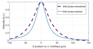 Ainsi, l'intensité SHG décroît rapidement dans le "bulk" (), en raison du déphasage de Gouy du faisceau gaussien.