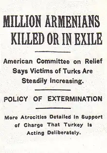 Le génocide arménien (en arménien : Հայոց ցեղասպանություն, Hayots tseghaspanoutyoun ; en turc : Ermeni Soykırımı), ou plus précisément le génocide des Arméniens, est un génocide perpétré d'avril 1915 à juillet 1916, voire 1923[Note 2], au cours duquel les deux tiers des Arméniens qui vivent alors sur le territoire actuel de la Turquie périssent du fait de déportations, famines et massacres de grande ampleur. Il est planifié et exécuté par le parti au pouvoir à l'époque, le Comité Union et Progrès (CUP), plus connu sous le nom de « Jeunes-Turcs », composé en particulier du triumvirat d'officiers Talaat Pacha, Enver Pacha et Djemal Pacha, qui dirige l'Empire ottoman alors engagé dans la Première Guerre mondiale aux côtés des Empires centraux. Il coûte la vie à environ un million deux cent mille Arméniens d'Anatolie et d'Arménie occidentale[Note 3].