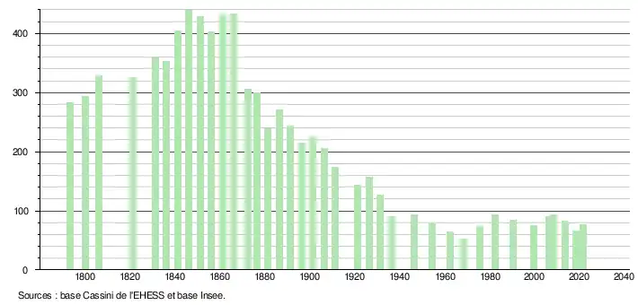 | L'évolution du nombre d'habitants est connue à travers les recensements de la population effectués dans la commune depuis 1793. Pour les communes de moins de 10 000 habitants, une enquête de recensement portant sur toute la population est réalisée tous les cinq ans, les populations légales des années intermédiaires étant quant à elles estimées par interpolation ou extrapolation[31]. Pour la commune, le premier recensement exhaustif entrant dans le cadre du nouveau dispositif a été réalisé en 2008[32]. En 2021, la commune comptait 76 habitants[Note 6], en diminution de 2,56 % par rapport à 2015 (Haute-Garonne : +7,43 %, France hors Mayotte : +1,84 %). |